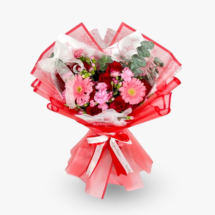10 Rosas rojas + 2 gerveras + flores.