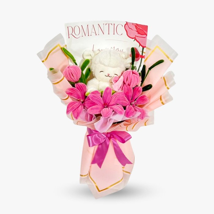 Ramo de 2 tulipanes + 3 lirios de limpiapipa + peluche.