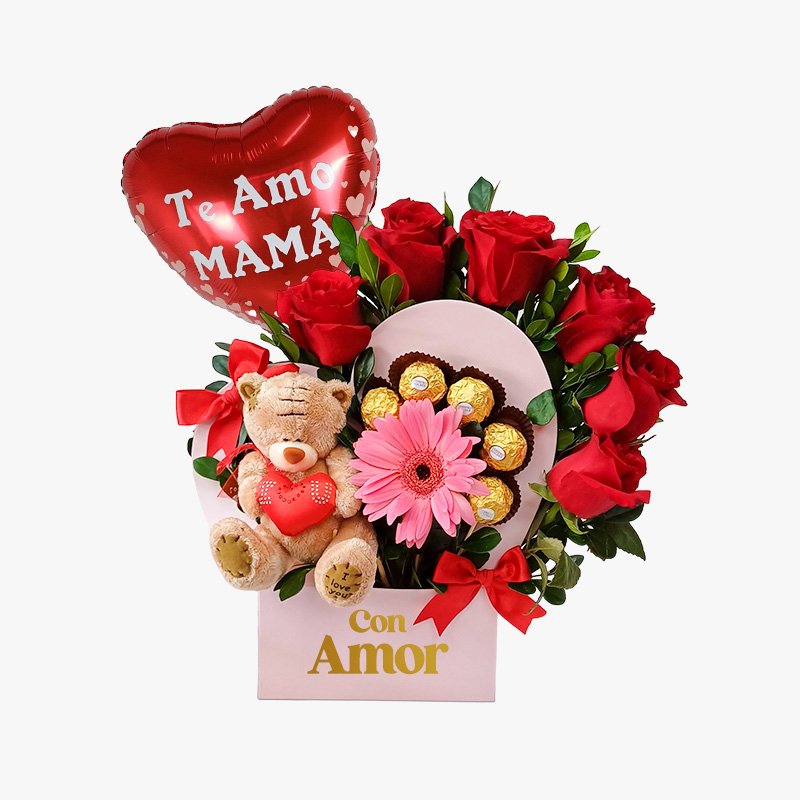 Arreglo Corazón con 5 Rosas + Osito + 5 Ferreros